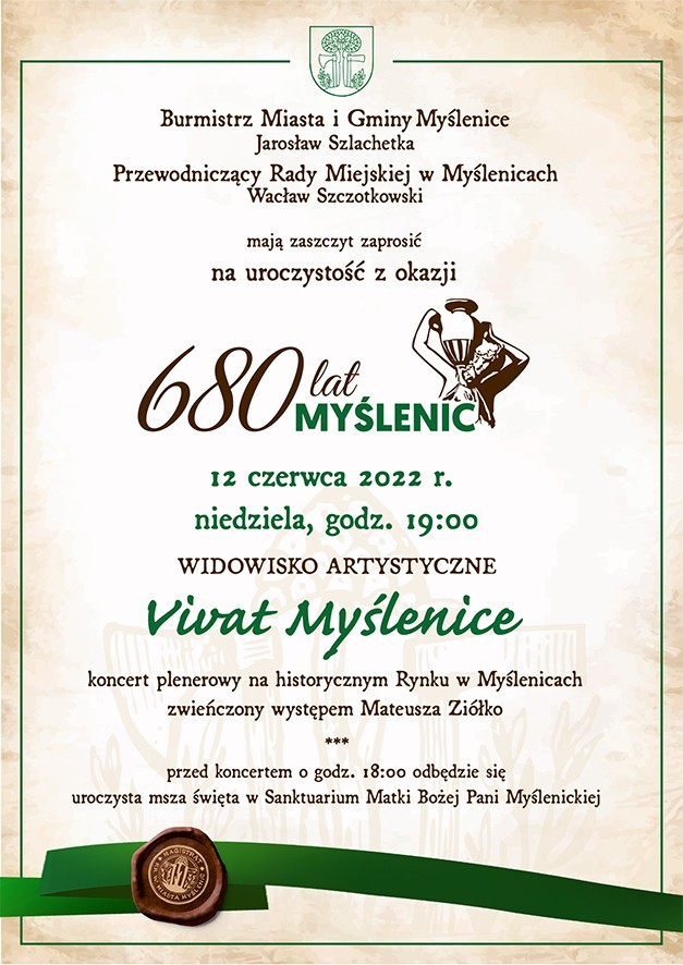 Obchody jubileuszu 680-leia lokacji Myślenic rozpoczną się w czerwcu 2022 rok widowiskiem inauguracyjnym na historycznym rynku w Myślenicach. W widowisku stworzonym specjalnie na te okazje udział weźmie blisko 150 wykonawców, artystów i amatorów związanych na co dzień z Gminą Myślenice. Koncert podczas którego zaprezentują się: Zespół Pieśni i Tańca „Ziemia Myślenicka”, zespół instrumentalny (smyczkowy), zespół jazzowy, Szkoła Muzyczna I st. w Myślenicach, Reprezentacyjna Orkiestra Dęta, amatorskie grupy teatralne oraz zawodowi wokaliści, instrumentaliści i tancerze.