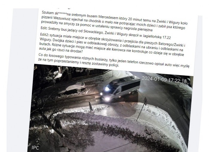 Od wczoraj przesyłacie do nas post jednego z mieszkańców, który opisuje zdarzenie, do którego miało dojść we wtorek 9 stycznia po godz. 17 w Myślenicach. Jak sytuację opisuje internauta: kierowca srebrnego busa marki mercedes na skrzyżowaniu ul. Batorego oraz Żwirki i Wigury "wjechał na chodnik, o mało nie potrącając moich dzieci i zabił psa, którego prowadziły na smyczy".