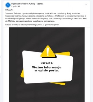„Z przykrością informujemy, że skradzione zostały trzy ikony autorstwa Grzegorza Giermka. Sprawa została zgłoszona na policję, a MOKiS jest w posiadaniu materiału z monitoringu wizyjnego.
