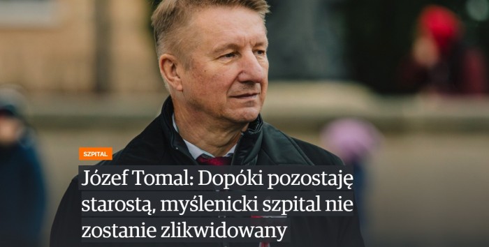 - Do Józefa Tomala (FZM/PO) w dniu 21 października wysłaliśmy zestaw pytań w tej sprawie. Opublikowaliśmy je w formie wywiadu, w którym starosta deklaruje: „Dopóki pozostaję starostą, myślenicki szpital nie zostanie zlikwidowany”.