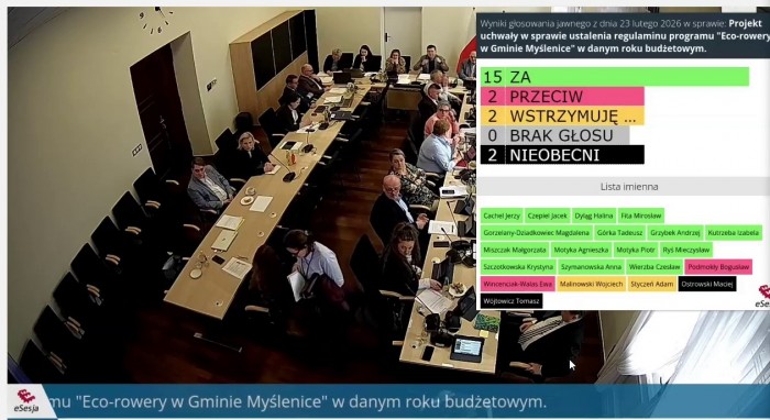 Wyniki głosowania jawnego w sprawie: Projekt uchwały w sprawie ustalenia regulaminu programu "Eco-rowery w Gminie Myślenice" w danym roku budżetowym: ZA (15): Cachel Jerzy, Czepiel Jacek, Dyląg Halina, Fita Mirosław, Gorzelany-Dziadkowiec Magdalena, Górka Tadeusz, Grzybek Andrzej, Kutrzeba Izabela, Miszczak Małgorzata, Motyka Agnieszka, Motyka Piotr, Ryś Mieczysław, Szczotkowska Krystyna, Szymanowska Anna, Wierzba Czesław; PRZECIW (2); Podmokły Bogusław, Wincenciak-Walas Ewa; WSTRZYMUJĘ SIĘ (2): Malinowski Wojciech, Styczeń Adam; NIEOBECNI (2); Ostrowski Maciej, Wójtowicz Tomasz.