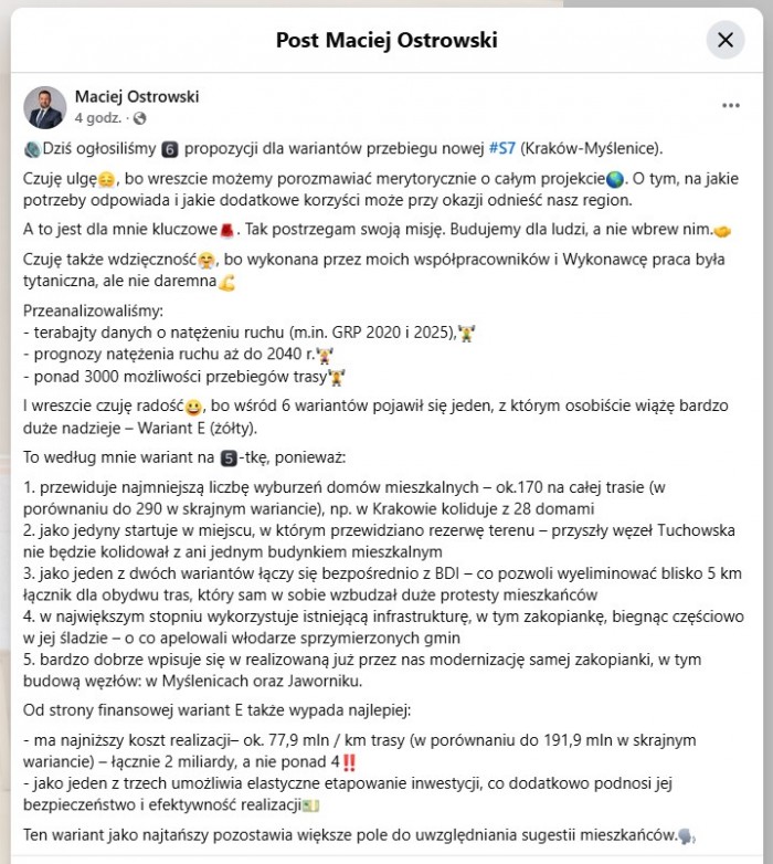 Na facebooku zamieścił post utrzymany w podobnym tonie. Przekonuje w nim m.in., że „to wariant na piątkę”, a wśród jego zalet wymienia najmniejszą liczbę wyburzeń domów (około 170), połączenie bezpośrednio z Beskidzką Drogą Integracyjną, co ma wyeliminować blisko 5-kilometrowy łącznik dla obydwu tras, wykorzystanie obecnego przebiegu zakopianki i wpisanie się w realizowaną przez GDDKiA modernizację DK7 i węzły Myślenice i Jawornik. Jak przekonuje Maciej Ostrowski; wariant E jest najtańszy (ok. 77,9 mln zł/km trasy - łącznie 2 mld zł).