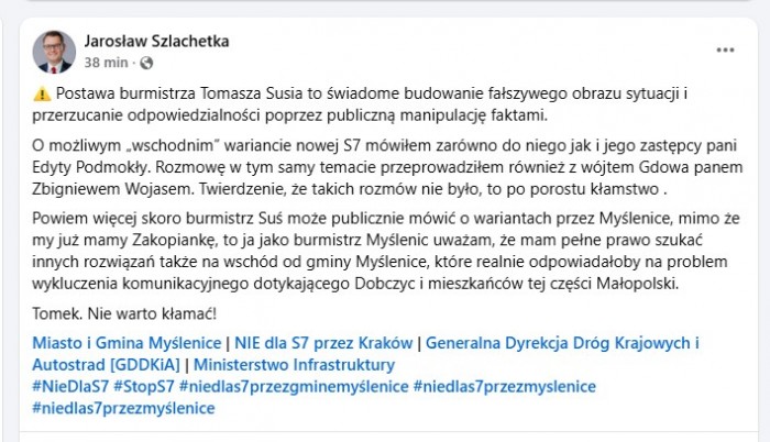- O możliwym „wschodnim” wariancie nowej S7 mówiłem zarówno do niego jak i jego zastępcy pani Edyty Podmokły. Rozmowę w tym samy temacie przeprowadziłem również z wójtem Gdowa panem Zbigniewem Wojasem. Twierdzenie, że takich rozmów nie było, to po porostu kłamstwo. (...) Tomek. Nie warto kłamać! - pisze burmistrz Szlachetka.