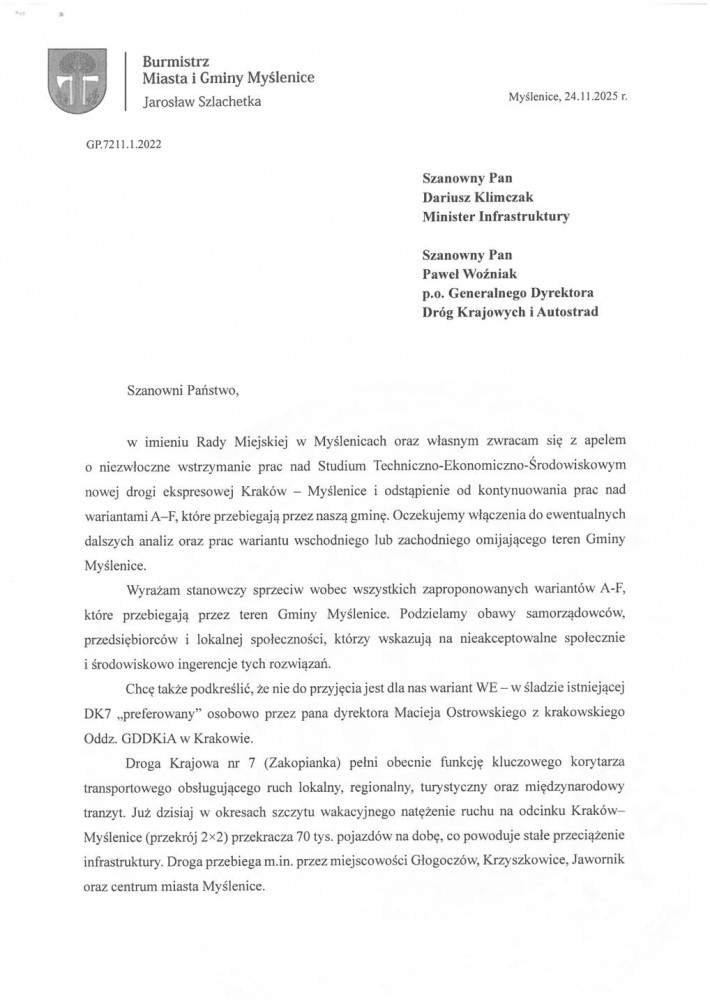 „Nie można zgodzić się na inwestycję prowadzoną w taki sposób, która grozi zrujnowaniem życia mieszkańców, podzieleniem gminy i dewastacją cennych terenów rozwojowych Myślenic” – pisze burmistrz Jarosław Szlachetka (PiS) i wysyła list do Ministra Infrastruktury.