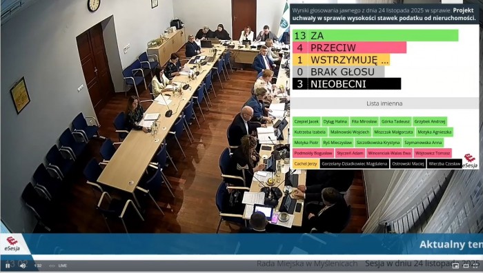 Radni przegłosowali wysokość stawek podatku od nieruchomości na terenie gminy Myślenice, które obowiązywać będą od 1 stycznia 2026 roku. Głosowanie odbyło się bez dyskusji i pozbawione było jakichkolwiek uwag.