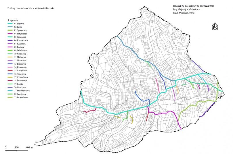Podajemy nazwy nowych ulic i numery działek. Lipowa (379/1, 379/2, 379/3), Leśna (378), Spacerowa (1488, 1757), Przymiarek (379/3, 1605, 1690), Jesionowa (1434), Kasztanowa (1798), Kalinowa (1505), Różana (1517), Jaśminowa (1533/1), Wrzosowa (1560/2), Malinowa (1560/2, 1560/1), Słoneczna (1567), Brzozowa (385), Krzemionki (414/1), Szczęśliwa (1383), Akacjowa (545), Czarnoleska (1303/10, 1303/8, 1303/13, 1303/15), Świerkowa (893), Krótka (414/1), Graniczna (94, 93, 92/3), Modrzewiowa (1451), Jagodowa, (1239), Dzwonkowa (1246).