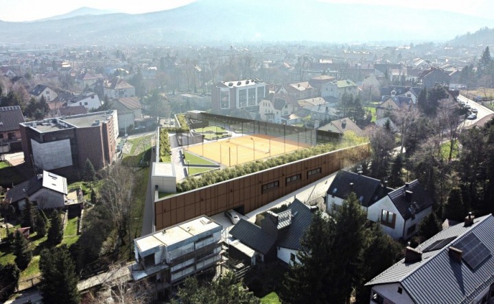 Dwupoziomowy parking mogący pomieścić nawet 184 samochody z lokalami, a także zielenią i boiskiem na dachu miał rozwiązać problem braku miejsc w centrum Myślenic.