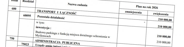 Na rok 2026 zabezpieczono środki na przygotowanie dokumentacji dla „parkingu z funkcją miejsca doraźnego schronienia w Myślenicach”