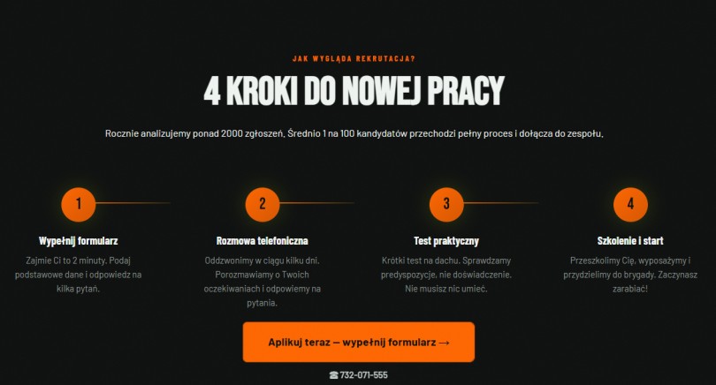 Proces składa się z czterech etapów. To: 1. wypełnienie formularza; 2. rozmowa telefoniczna; 3. test praktyczny na dachu; 4. szkolenie i rozpoczęcie pracy.