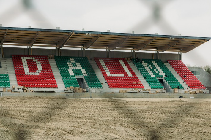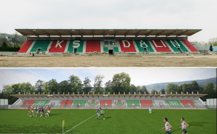Postęp prac na stadionie miejskim w Myślenicach jest coraz bardziej widoczny. W ostatnich dniach na trybunach zamontowano krzesełka w biało-zielono-czerwonej kolorystyce, układające się w napis „KS DALIN”. Trwają również roboty ziemne na płycie głównej.
