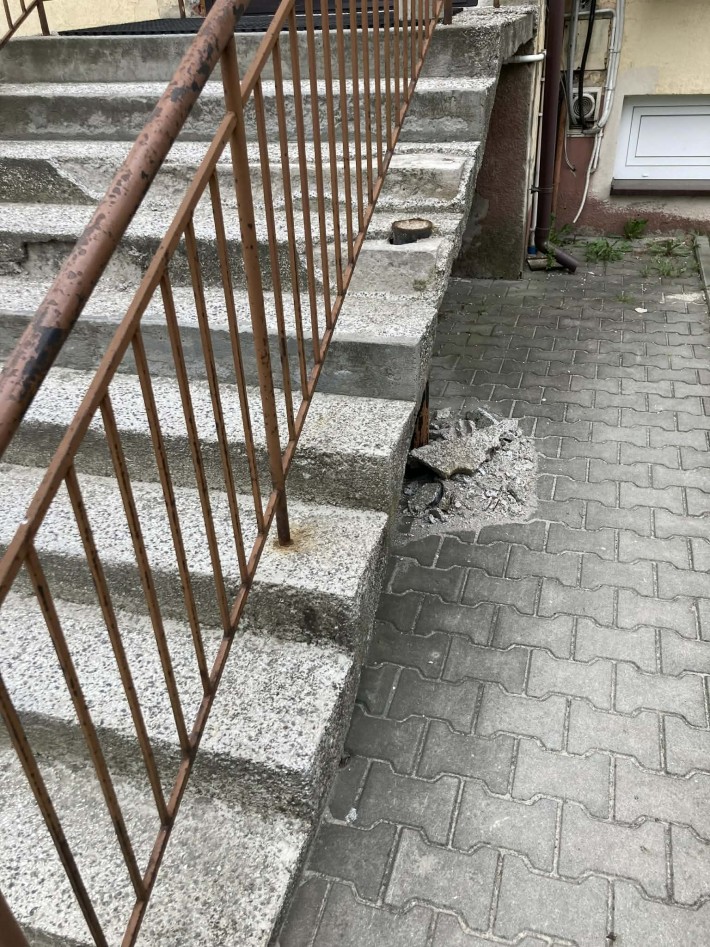 Na dowód przesyła też zdjęcia wejścia do budynku przy ul. Słowackiego. Jak widać jeden ze stopni jest ukruszony, a w niektórych miejscach pojawiły się pęknięcia.